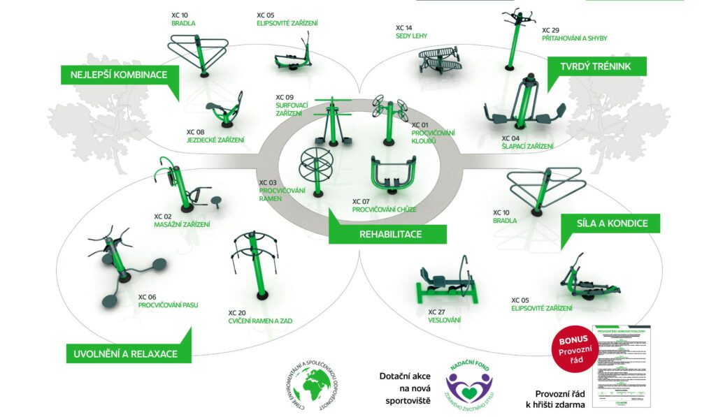O každém stroji si dozvíte v kompletním přehledu naší nabídky strojů řady XC. Každý fitness stroj je speciálně označen AKCE – DOTAČNÍ PŘÍSPĚVEK. Pokud máte zájem umístit na Vaše hřiště stroj, který v nabídce nadační akce není, prosím kontaktujte nás, rádi Vám nabídku vypracujeme.