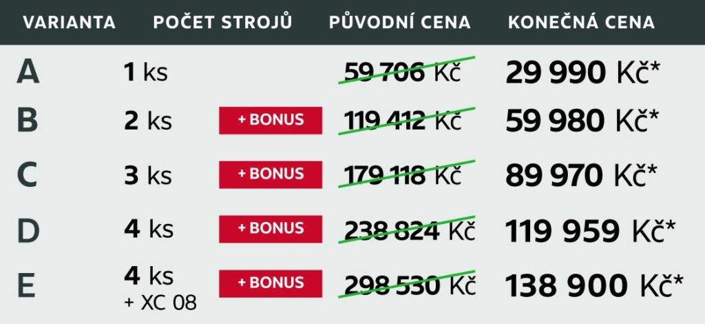 V nabídce této akce najdete celkem 14 fitness strojů. Vybírat můžete letos nově z pěti cenových variant A, B, C, D a E, které lze různě kombinovat. Například 5 strojů můžete získat objednávkou varianty B + C. Ve variantě E získáte ke čtyřem vybraným strojům náš tip XC 08 za zvýhodněnou cenu.