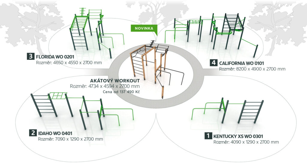 V nabídce najdete čtyři street workoutové sestavy vybrané tak, aby pokryly všechny finanční i prostorové možnosti obcí a měst.