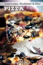 The flavors of this thin-crust pizza work wonderfully together. Make it extra special by making the thin-crust pizza dough from scratch. It’s really easier than you might think! Feel free to vary the toppings to your own liking, but, we think the combination of soppressata, mushrooms, and black olives are pizza perfection!